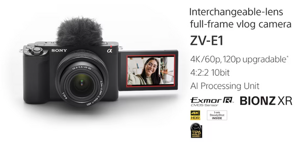 The ZV-E1 is the world's most compact, lightweight vlog camera with a full-frame CMOS sensor and lens interchangeability. Its small size and light weight make it ideal for handheld shooting as well as for gimbal and drone mounting, for extraordinary mobility that gives vloggers new capabilities for creative expression.