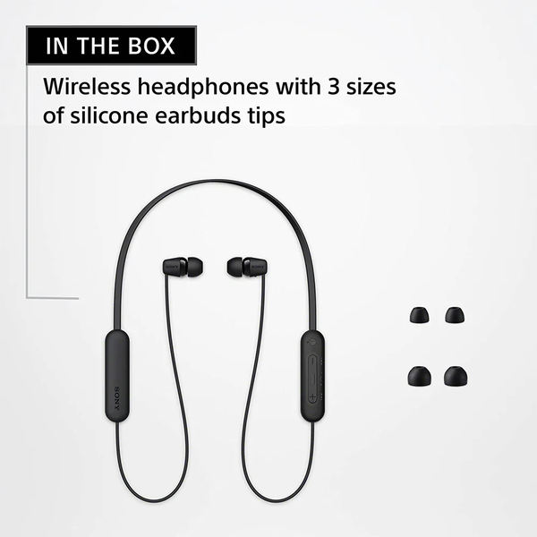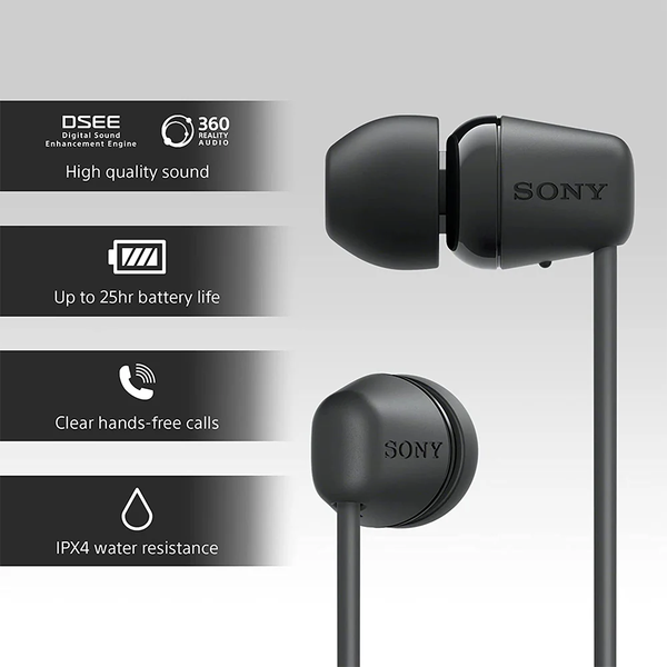Wireless Bluetooth headphones that take your music wherever life brings you. With up to 25hrs of battery life, the WI-C100 headphones provide high-quality listening. Comfortable and easy to use, these headphones provide piece of mind with a IPX4 Splash resistance design.
